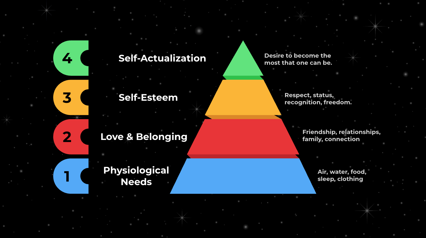 Every buying decision traces back to Maslow's hierarchy of needs. In modern society, basic physiological needs (air, water, food) are largely met, which pushes consumers to fulfill emotional desires at the top of the hierarchy: self-esteem, self-actualization, love and belonging.
