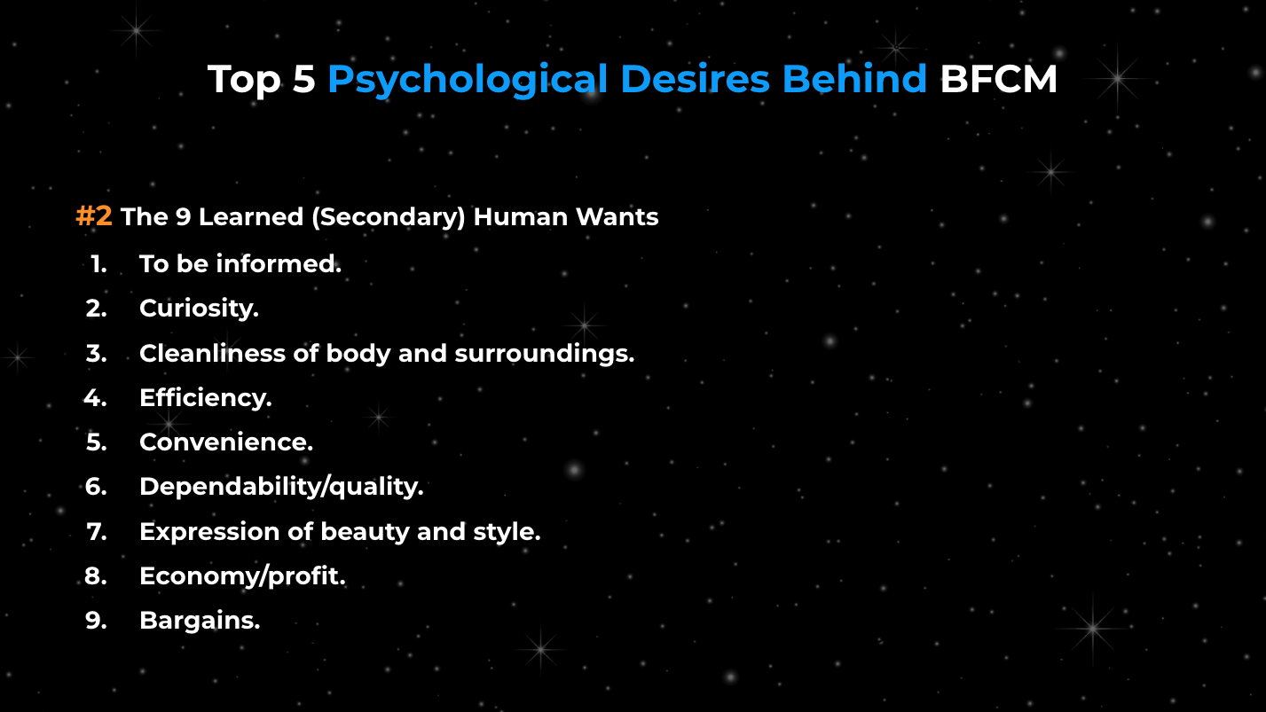 Unlike core desires you're born with, these wants develop through socialization. Three are especially relevant to BFCM: