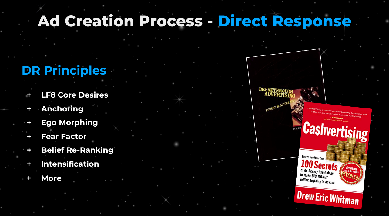 - Direct Response Principles - Use 6-8 proven psychological triggers per ad