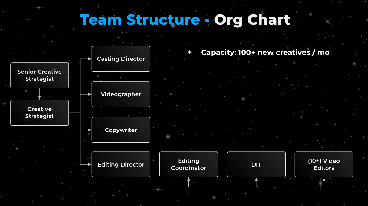 4. Install Editing Directors. Don't skip this. Senior editors who oversee a pod of 5–8 editors are the glue. They handle quality control, flag issues early, and own the relationship between the creative team and the strategy layer.